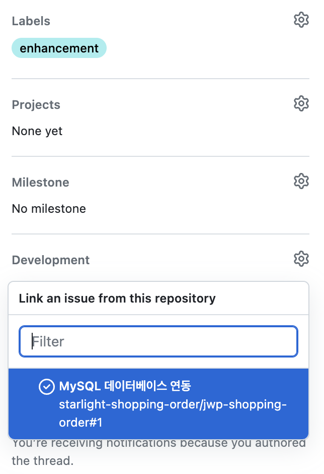 이때, 앞서 작성한 issue를 엮어서 함께 보낼 수 있다. 아래의 사진에서처럼 Development 설정에서 관련 issue를 선택하면 된다.