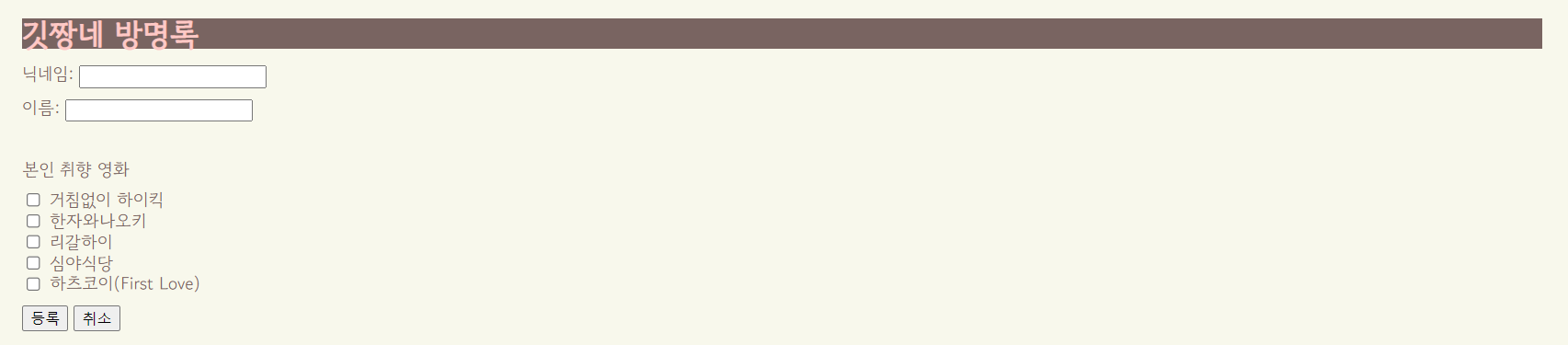 아래에는 방명록도 구현해놨다. 나와 영화 취향이 겹치는 개수를 alert 해준다