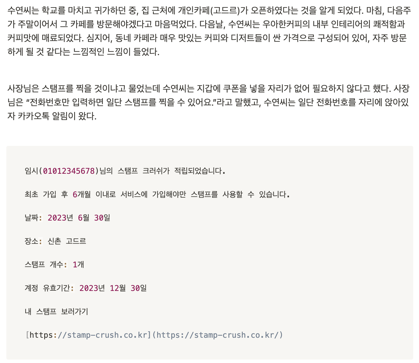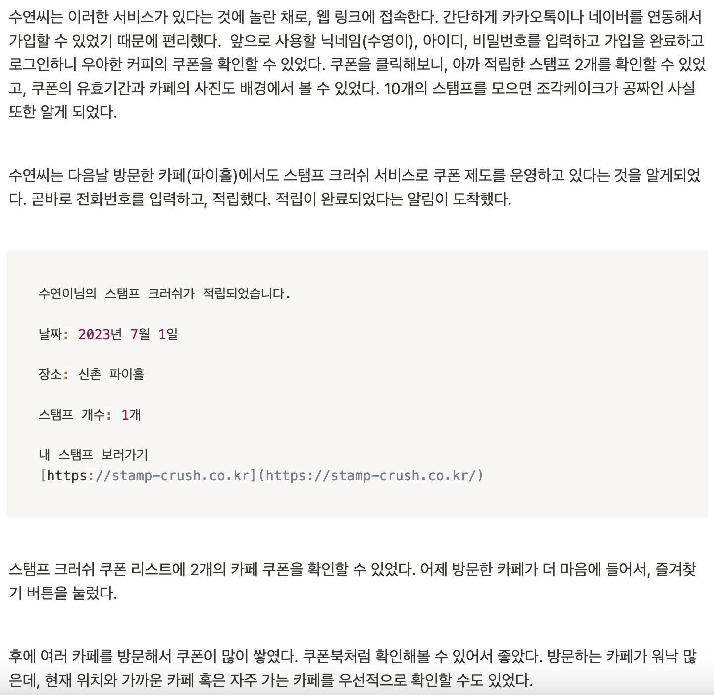 | [우테코] 스탬프크러쉬 서비스 페르소나와 유저 시나리오 (feat. 페르소나 자판기 깃짱) (0) | 2023.07.20 |