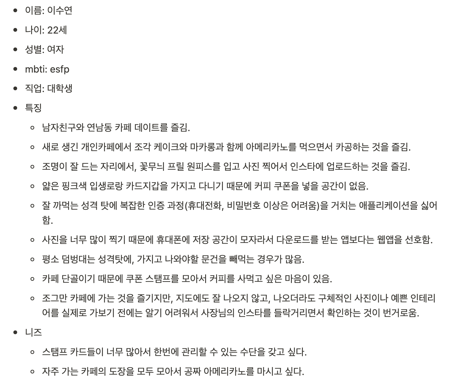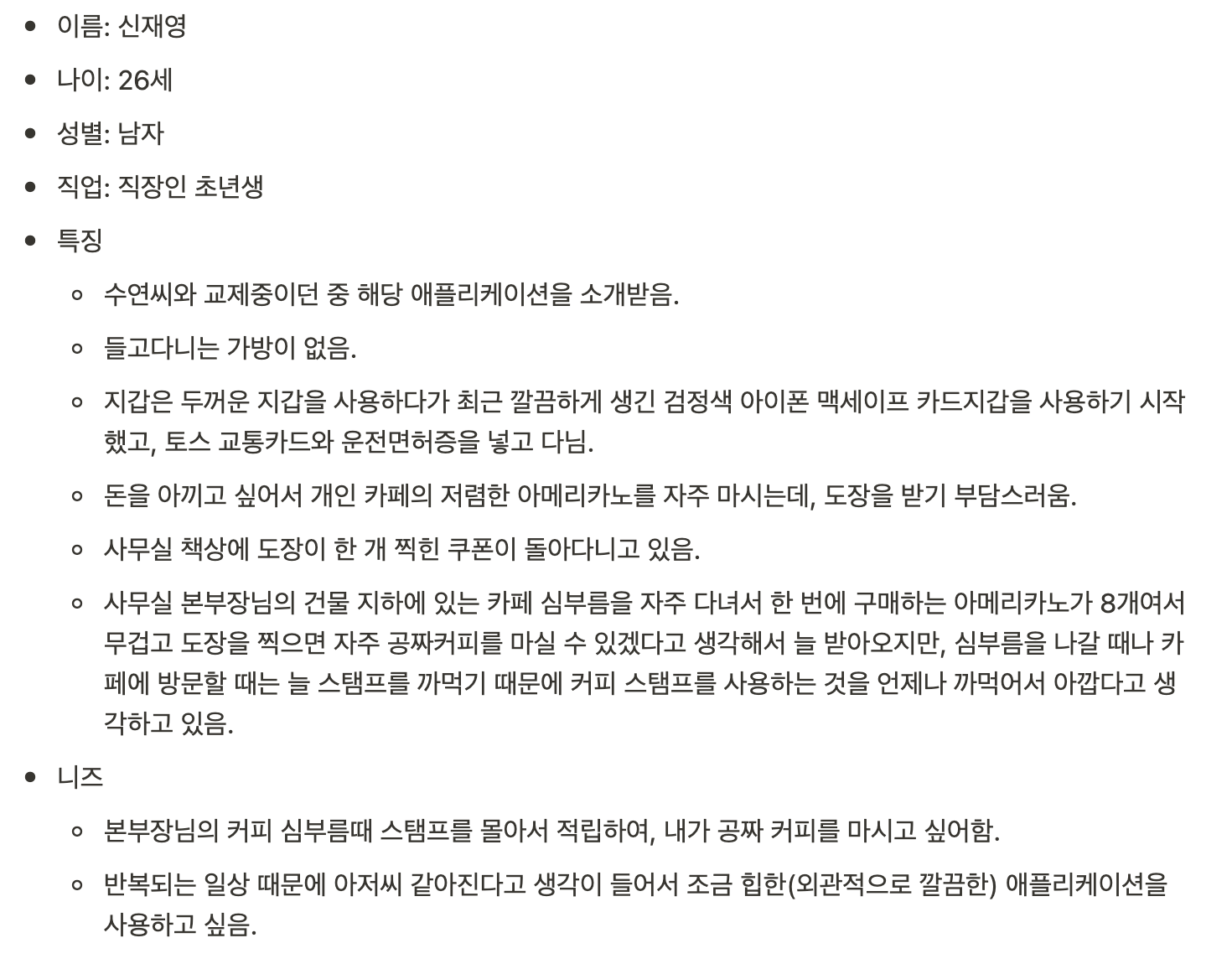 아래는 우리 팀에서 작성한 페르소나의 예시다. 최대한 구체적으로 작성하도록 하자.