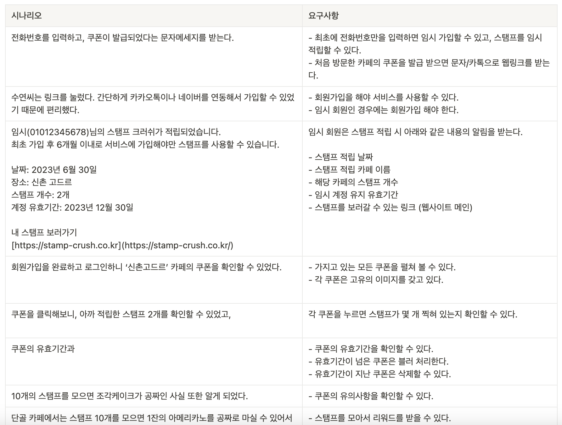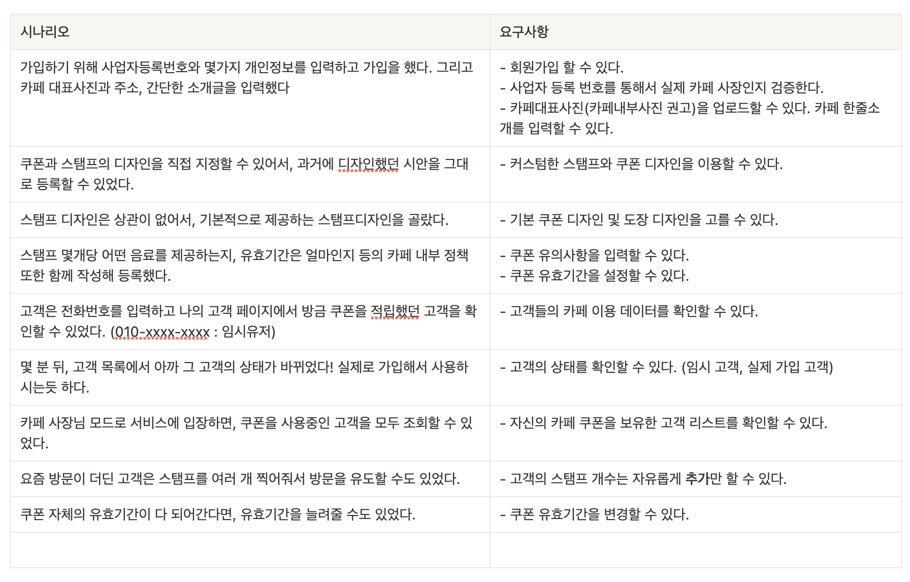 마찬가지로 카페 사장 페르소나 박예빈씨를 생각하면 작성한 시나리오로부터도 요구사항을 도출할 수 있다.