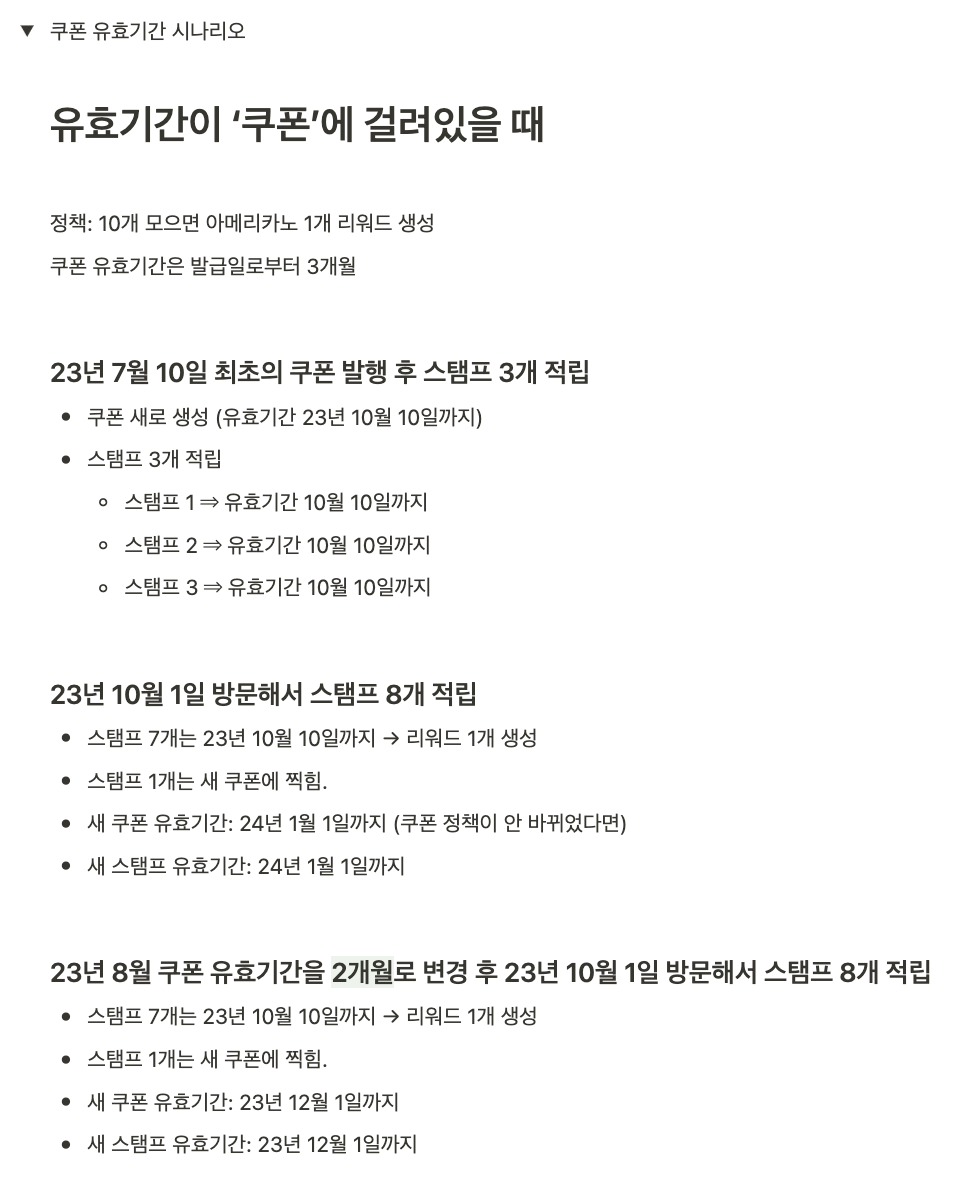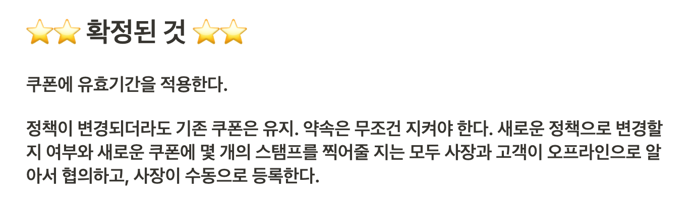 기존에 사용하던 종이쿠폰의 정책은 물리적 특성상 ‘쿠폰에 유효기간이 걸린’ 형태였는데, 사장님은 이것에서 새로운 정책인 ‘스탬프 유효기간’을 공부해야만 사용할 수 있다. 마찬가지로 고객도 이 정책을 공부해야만 사용할 수 있다.