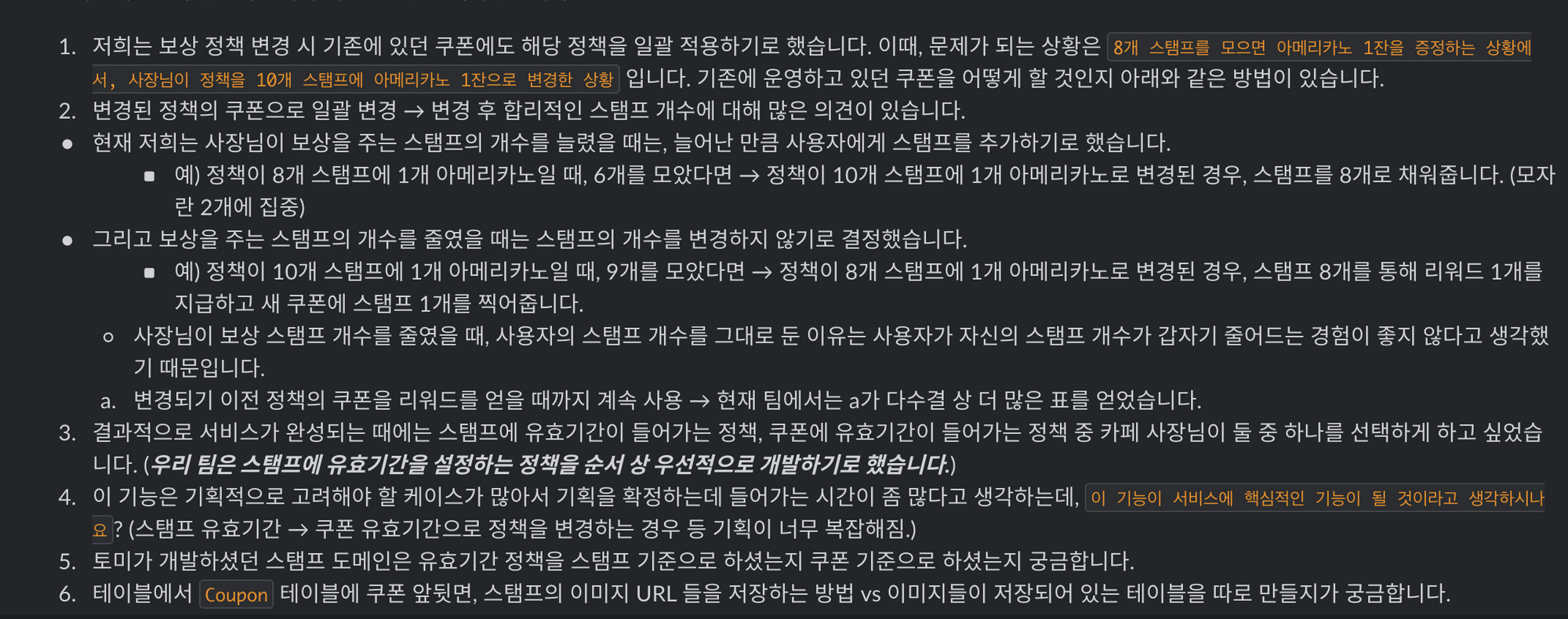 결국 둘 중 '스탬프에 유효기간이 걸린 경우'를 생각하고 다시 기획을 시작했는데, 이후에도 카페 정책 변경에 따른 쿠폰을 어떻게 변경할 것인지에 대해 의견이 분분했다. 결국에는 코치인 토미에게 도움을 요청했다.