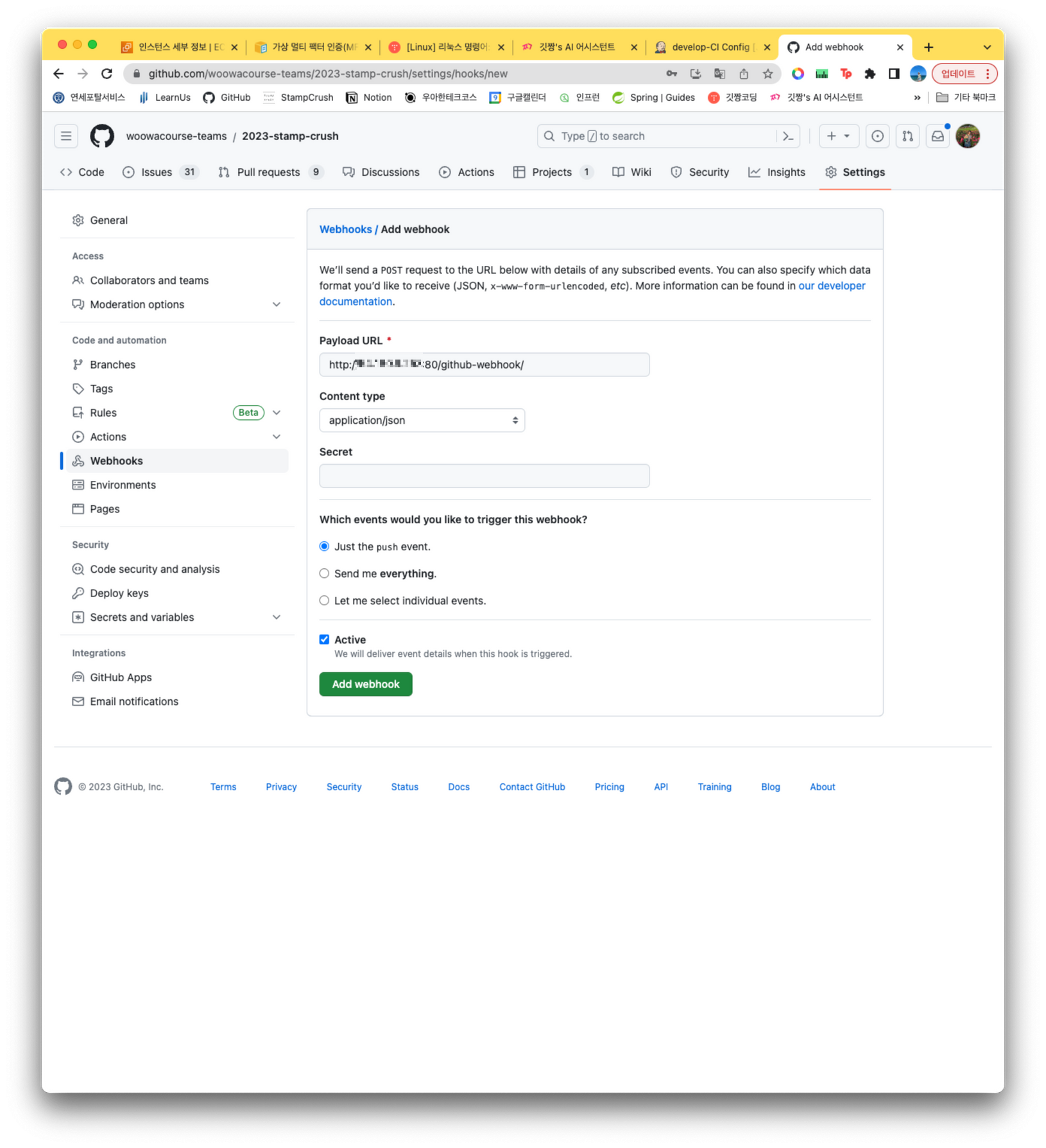 Payload에는 우리 인프라 서버의 IP로 요청을 보내고 뒤에 /github-webhook을 써놓으면, 이후에 인프라 서버 쪽에서 깃허브 웹훅을 트리거로 받겠다고 설정하면 인식할 수 있음!