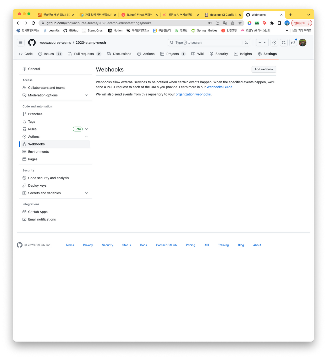 깃허브 web hook을 설정해서 우리가 설정한 이벤트에 대해서 인프라 서버에 요청이 가도록 하자!