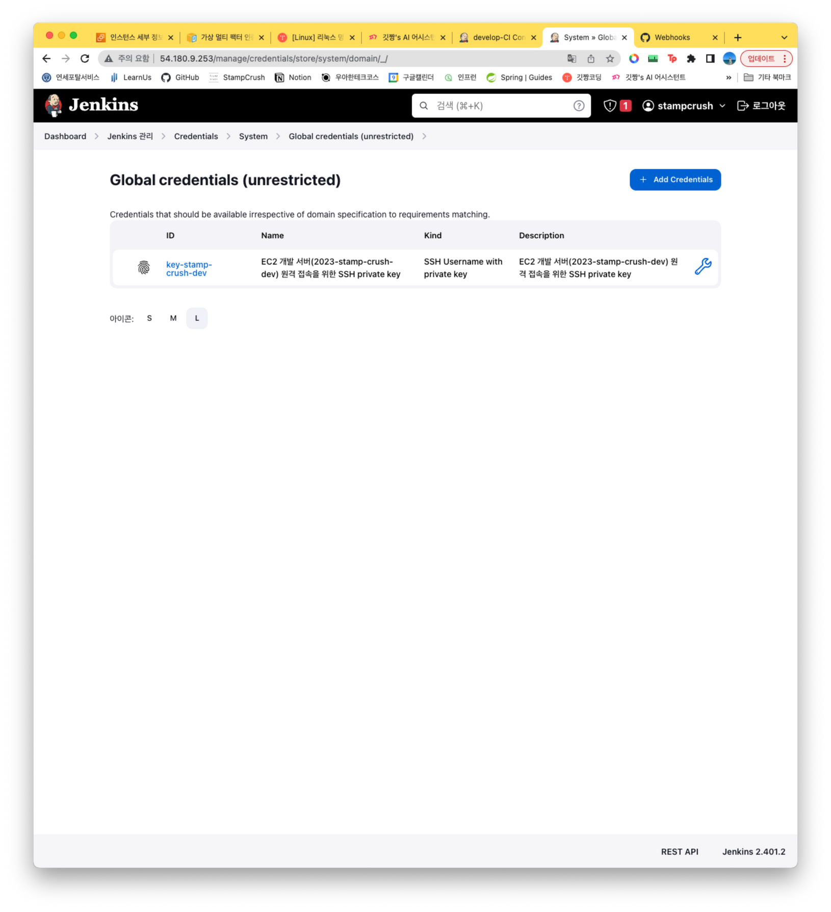 따라서 이걸 그냥 스크립트에 넣어버릴 순 없으니깐 젠킨스에서 제공하는 credentials에 등록해서, 좀 더 안전하게 보관한다.