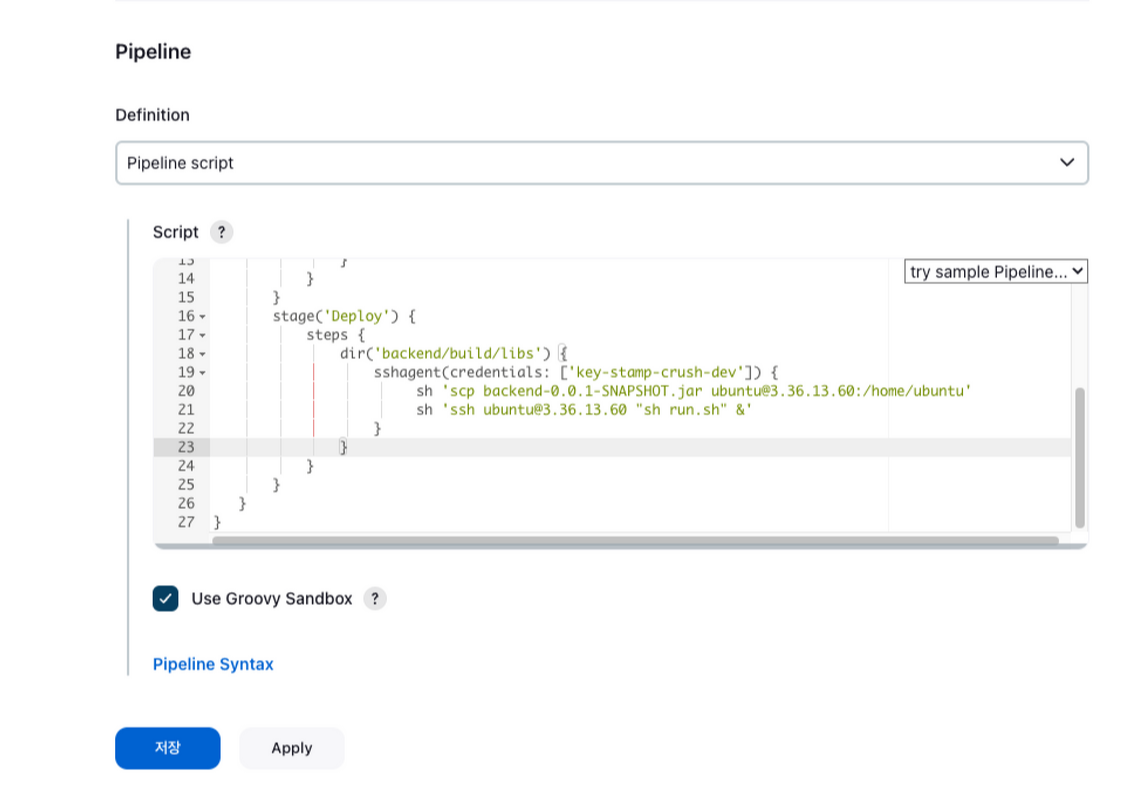이때 sshagent 플러그인은 젠킨스 설정에서 미리 다운로드 받아놔야 하고,