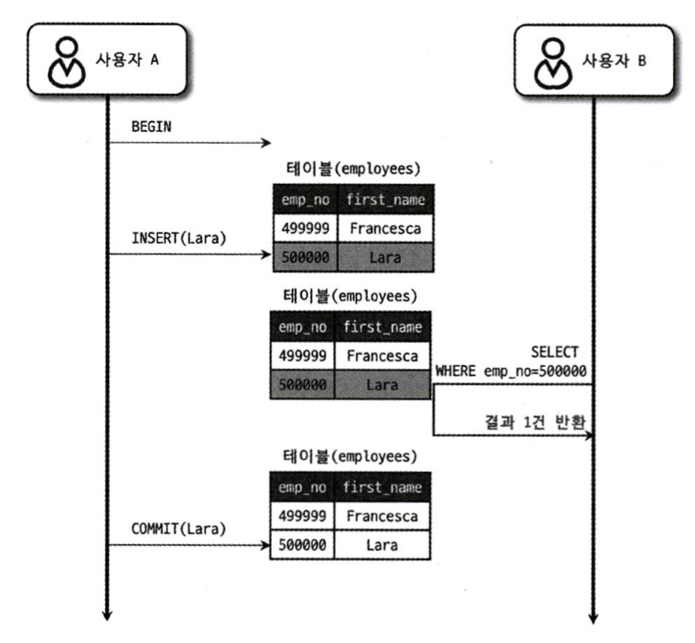 - 사용자 A가 insert된 Lara를 롤백한다고 하더라도, 여전히 사용자 B는 Lara가 존재한다고 생각하고 계속 처리를 하게 되는 문제점