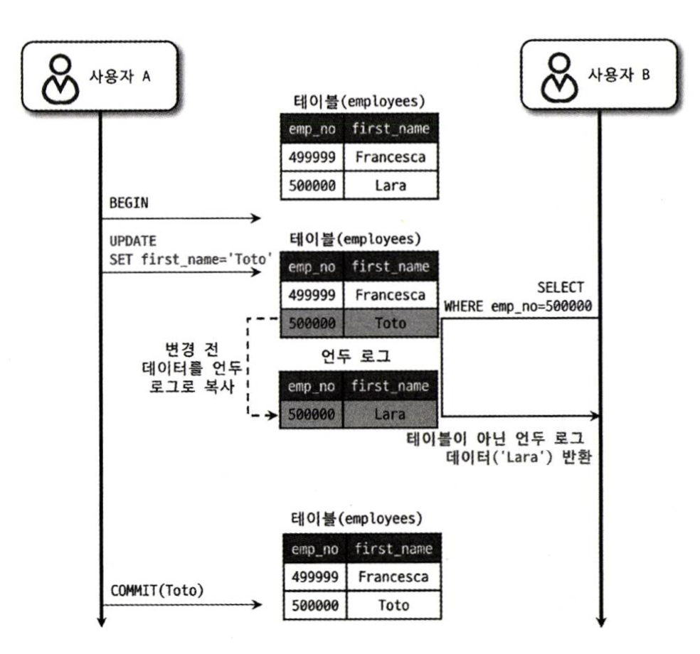 - 모든 트랜잭션은 고유한 트랜잭션 번호를 가지고 있으며, 언두 영역에는 백업된 레코드에 변경을 발생시킨 트랜잭션의 번호가 포함되어 있음.