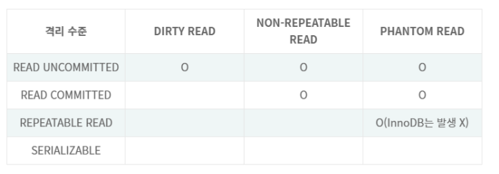 위 표에서 아래로 갈수록, 트랜잭션 간 데이터의 격리(고립) 정도가 높아지며, 동시 처리 성능이 떨어진다.