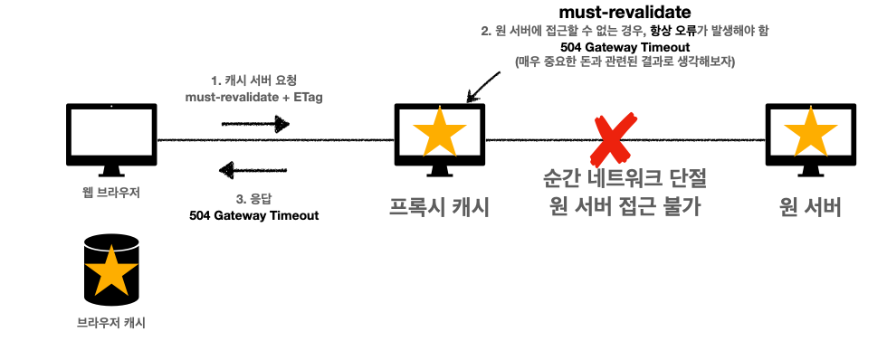 따라서 원 서버에 접근할 수 없는 경우에는 항상 오류가 발생해야 한다. 504 Gateway Timeout을 반환한다.