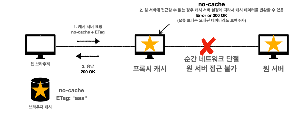 하지만, 원 서버에 접속할 수 없는 경우에는 에러를 반환하거나, 때에 따라서 오래된 데이터라도 보여주는 것이 나을 경우에는 200 OK로 응답 후에 캐시에 저장된 데이터를 보여주도록 설정할 수 있다.