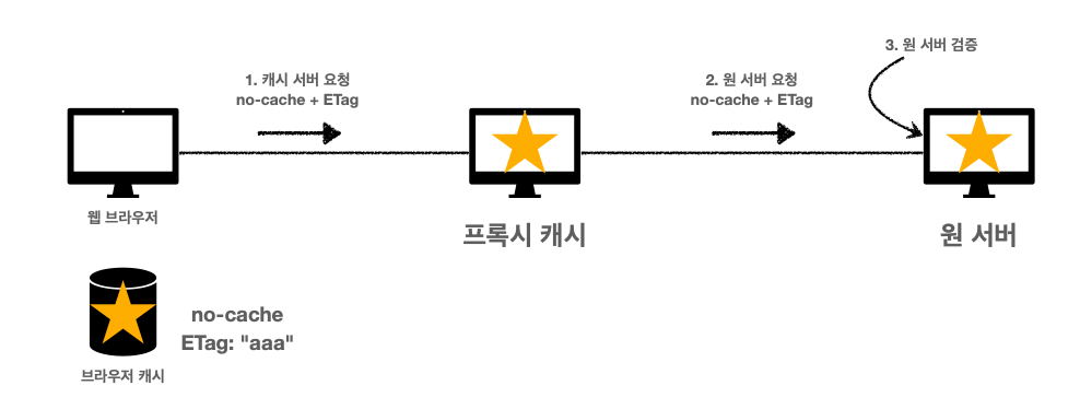 no-cache의 경우에는 원 서버에 반드시 접속해서 현재의 캐시 데이터가 fresh한지 확인 후에 캐시 데이터를 사용해야만 한다.