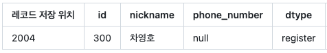 - JPA에서 dtype을 사용해서 register_customer, temporary_customer 중 어떤 테이블에서 찾을지에 대해 결정하기 때문에 fk 제약조건을 풀어 1004 레코드를 강제로 삭제하더라도, id:2로 검색한다면 새로 생긴 레코드를 찾아오지 못하고 null을 반환해버림.