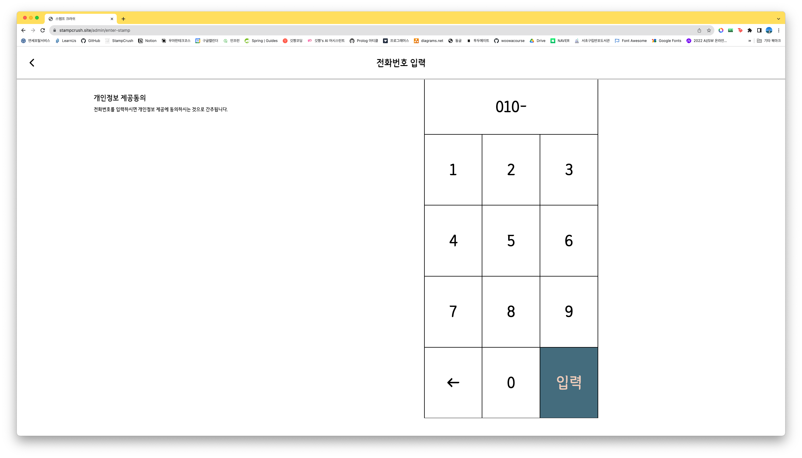 우리 서비스는 사장모드의 [스탬프 적립] 기능에서 고객이 전화번호를 입력하면, 적립이 되는 시스템이다.