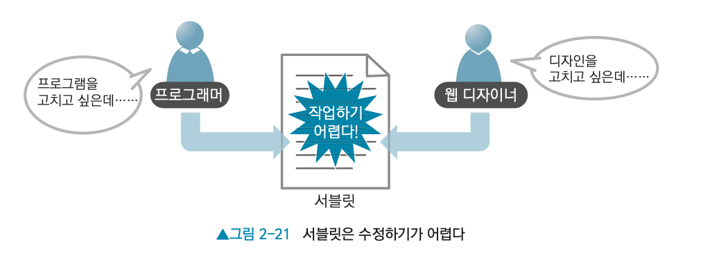 - 대규모 사이트에서는 프로그래밍하는 사람과 화면의 디자인을 담당하는(HTML을 작성하는) 사람이 분담해 작업함.
