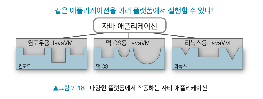 - 자바는 윈도우나 맥 OS, 리눅스 같은 서로 다른 플랫폼에서 같은 프로그램을 실행할 수 있어서, 다양한 플랫폼상에서 작동하기 때문에 개발하기가 쉬움