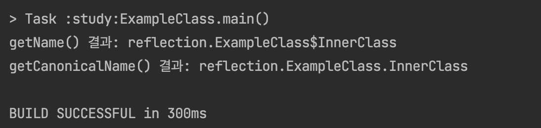InnerClass의 경우getName()은"com.example.ExampleClass$InnerClass"를 반환합니다.