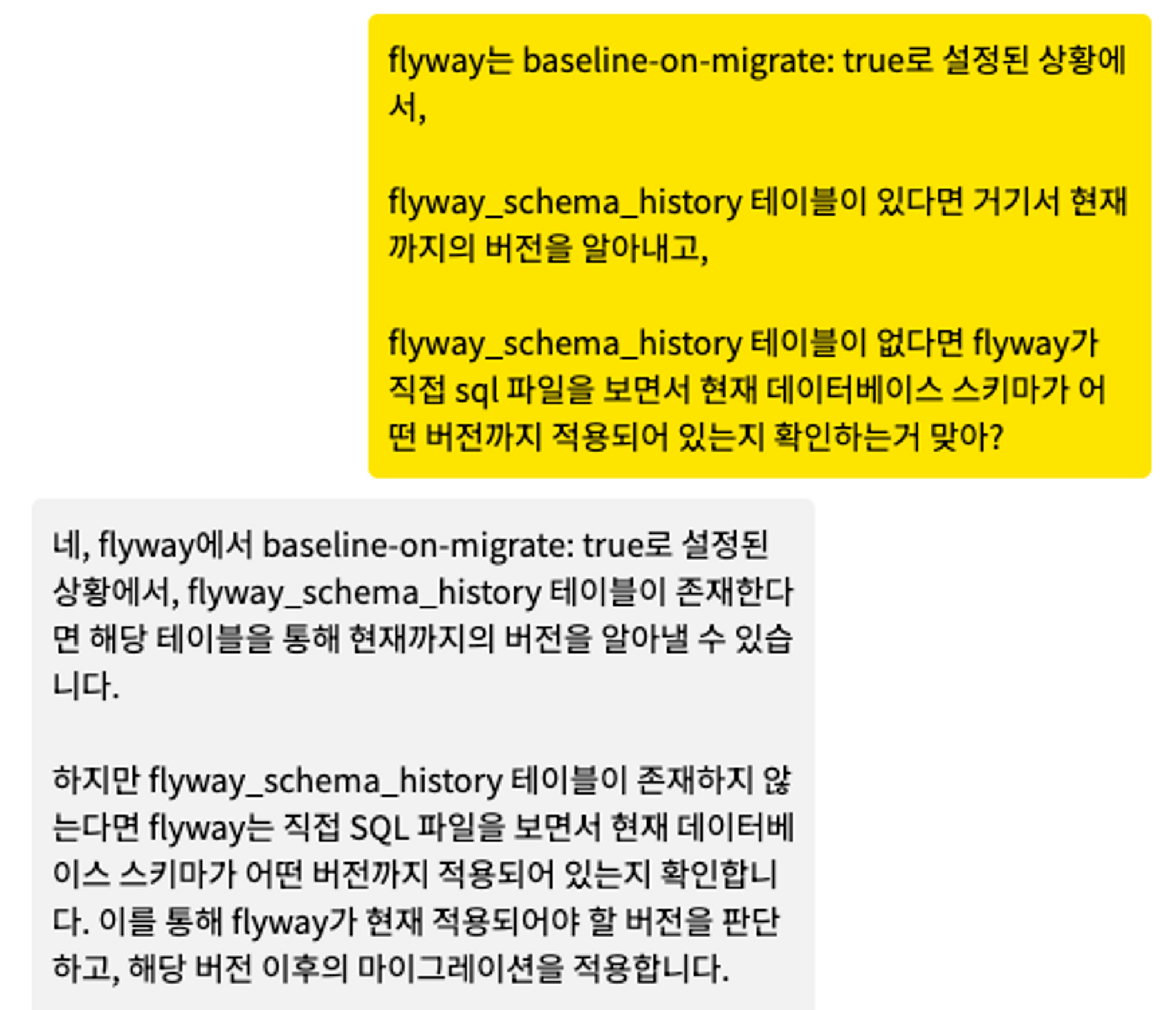 flyway는 flyway_schema_history 테이블이 없는 상태에서는 현재 버전이 어디까지 적용되어 있는지 직접 sql 파일과 데이터베이스 스키마를 비교하여 확인한다. 이를 통해 flyway는 버전이 존재하지 않는 경우 해당 버전의 SQL 파일을 실행하여 데이터베이스를 업데이트한다.