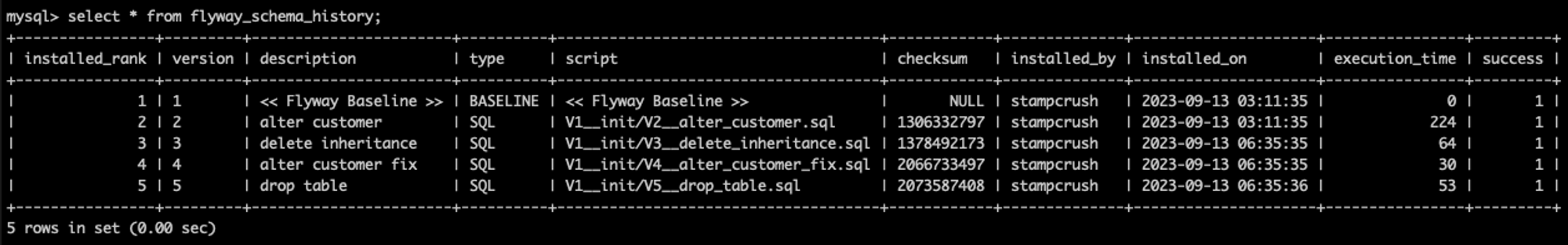 - installed_rank: 마이그레이션 스크립트가 적용된 순서를 나타냅니다.