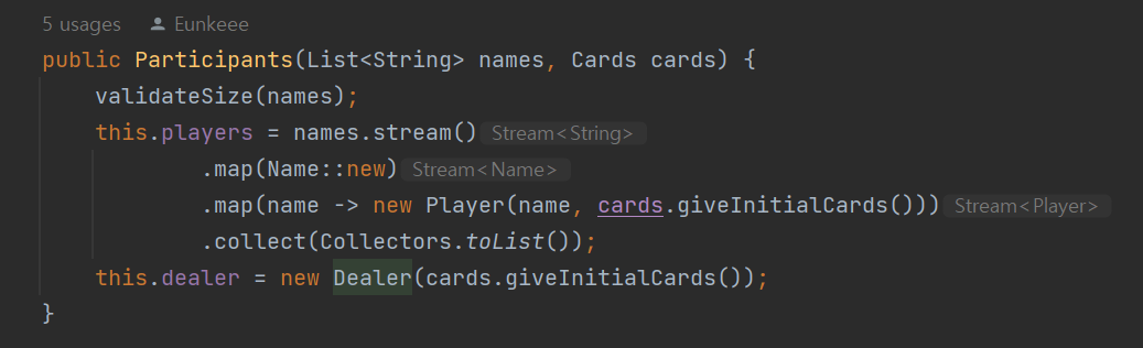 처음에 List<String> 형태의 names로부터 스트림을 생성했기 때문에 String으로 이루어진 스트림이 생성되었다. 후에 각 요소 name에 대해서, name -> new Name(name)을 실행했더니 이제는 원시값이 포장된 Name 타입으로 이루어진 스트림으로 가공되었다. 후에 new Player()까지 호출하니 Player로 이루어진 스트림으로 가공되었다.