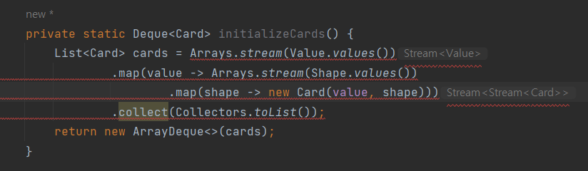 private static Deque<Card> initializeCards() {