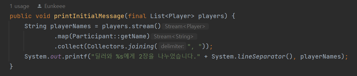 %s 자리에 Stream<String>으로 이루어진 Player들의 이름을 사이에 쉼표를 찍어서 넣고 싶다.....
