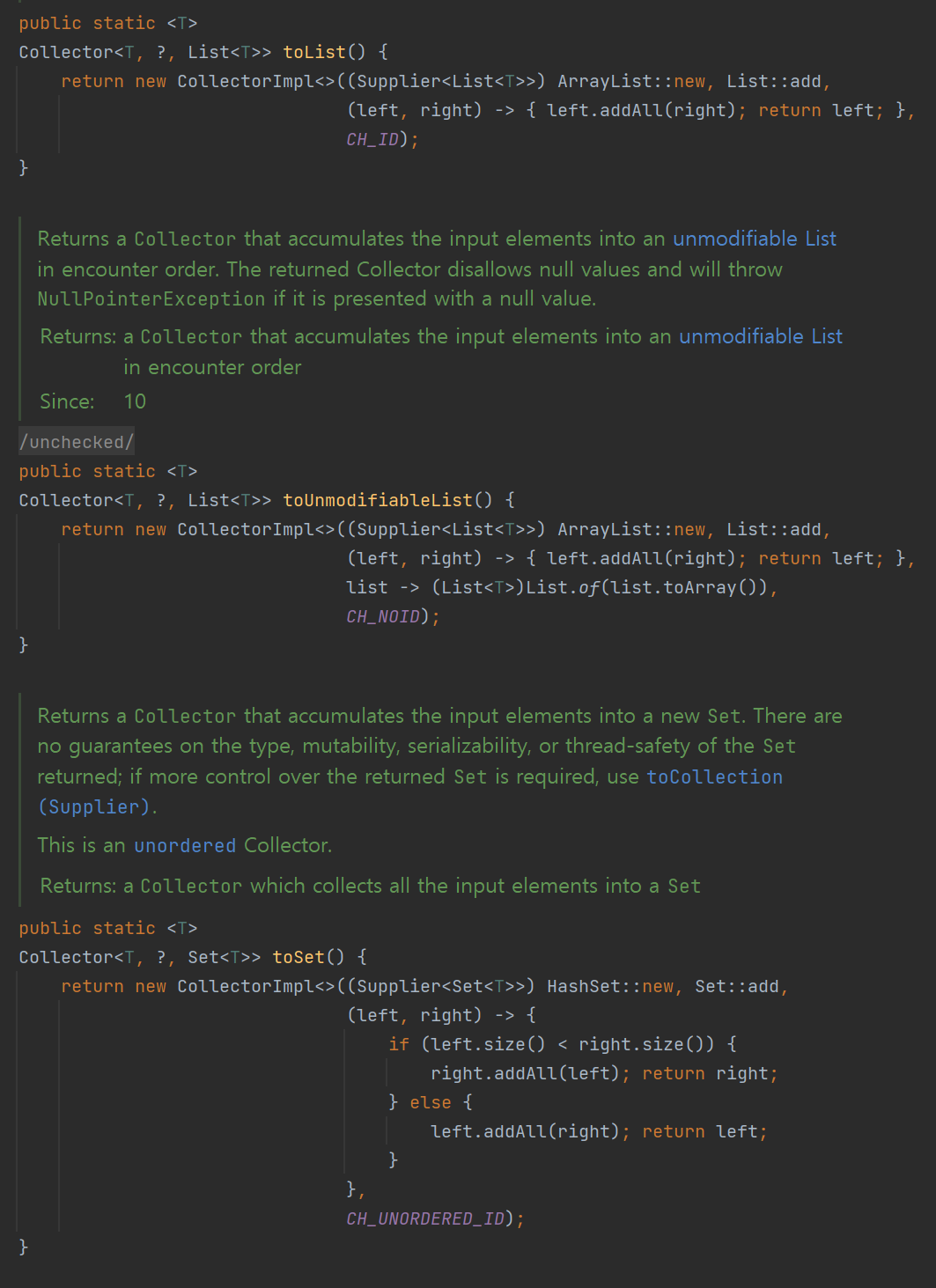 내부에 Collector를 구현한 클래스의 객체라면 뭐든 반환하게 할 수 있다. 사실 다 외우려고 하기보다는 IDE가 추천해주는 대로 가는 것이 유익할 때가 가장 많다^..^... 나도 주관식으로 쓰라고 하면 잘 못 쓰지만, IntelliJ가 추천해주는 것 중 선택하는 것은 자신있다.