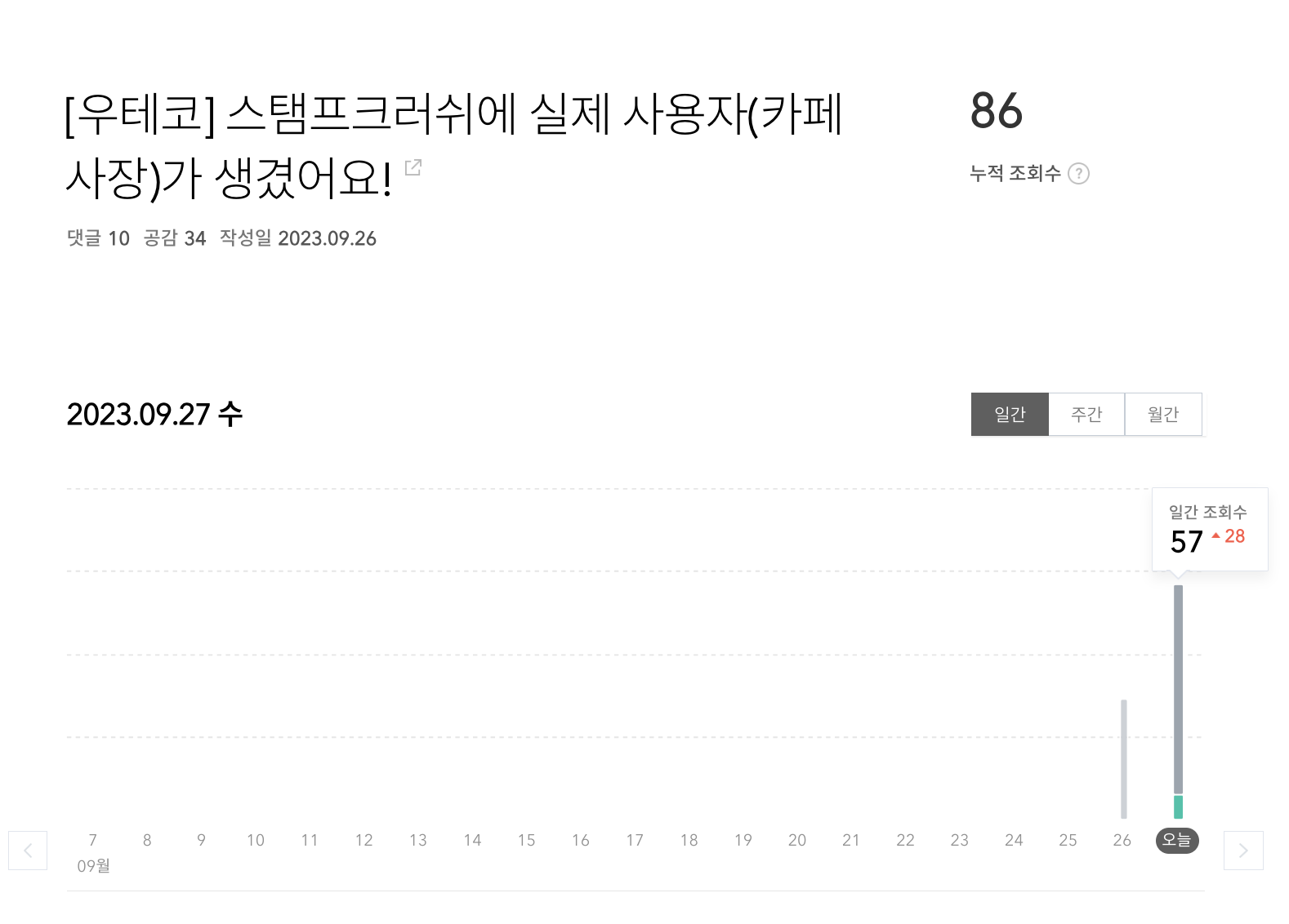 - 그리고 어제 작성했던 스탬프크러쉬에 실제 사용자(카페 사장)가 생겼어요! 라는 글에 지금 하루 아침만에 좋아요가 34개로 갑자기 폭발적 반응을 보이고 있다. 무슨 일이지?!?!?!