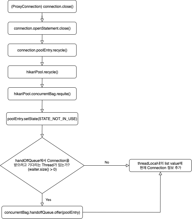 커넥션은 커넥션 풀에 반환되고, 이후에 handOffQueue에서 커넥션을 받으려고 기다리는 쓰레드가 있다면, 해당 쓰레드에 커넥션을 주게 된다.