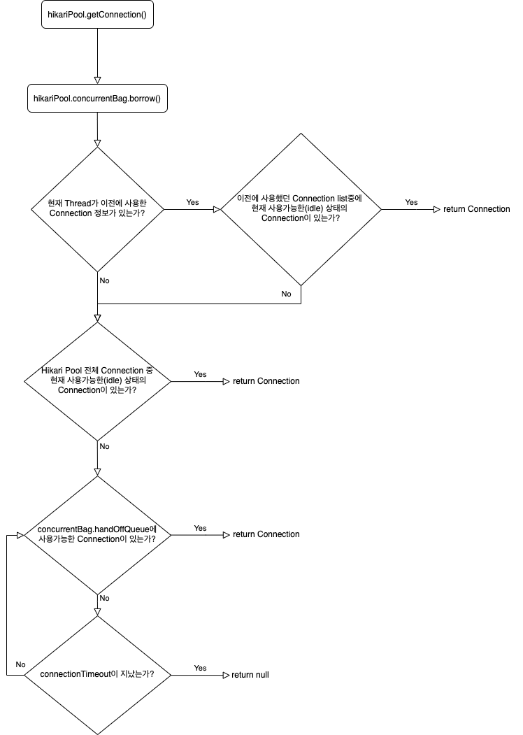 외부에서 HikariPool.getConnection()을 호출하게 되면, 내부적으로는 ConcurrentBag.borrow()을 호출하고, 커넥션을 요청한 쓰레드가 이전에 사용한 동일한 커넥션이 있는지 먼저 방문 내역을 살펴보고, 최대한 동일한 커넥션을 주려고 한다.