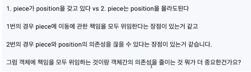 장점은 Piece가 이동에 대한 책임을 가져서 좀 더 능동적인 체스말을 만들 수 있다는 것이었고,