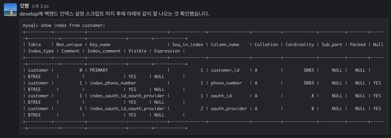그리고, 얼른 인덱스 설정 관련된 명령어를 Flyway를 통해 설정하도록 수정했다.