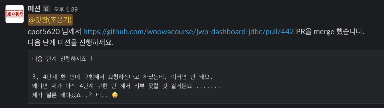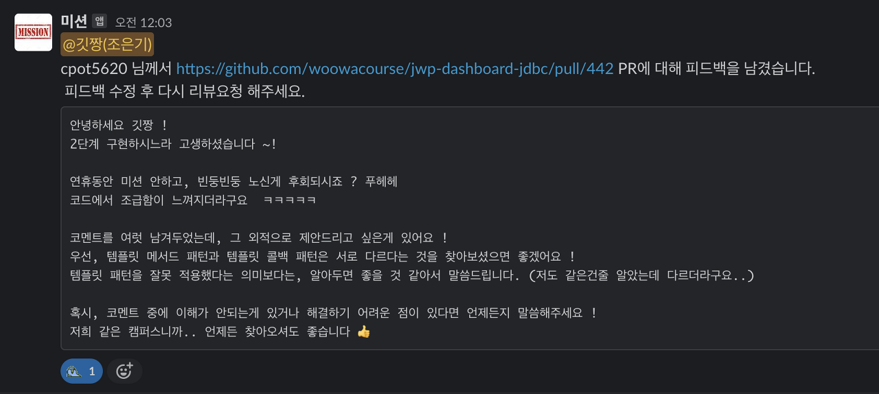 이번 JDBC 미션 리뷰어인 쥬니가 이렇게 리뷰를 남겨줬다 흑흑 팩트폭행