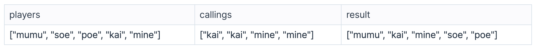 callings의 길이 ≤ 1,000,000 callings는players의 원소들로만 이루어져 있습니다.- 경주 진행중 1등인 선수의 이름은 불리지 않습니다.