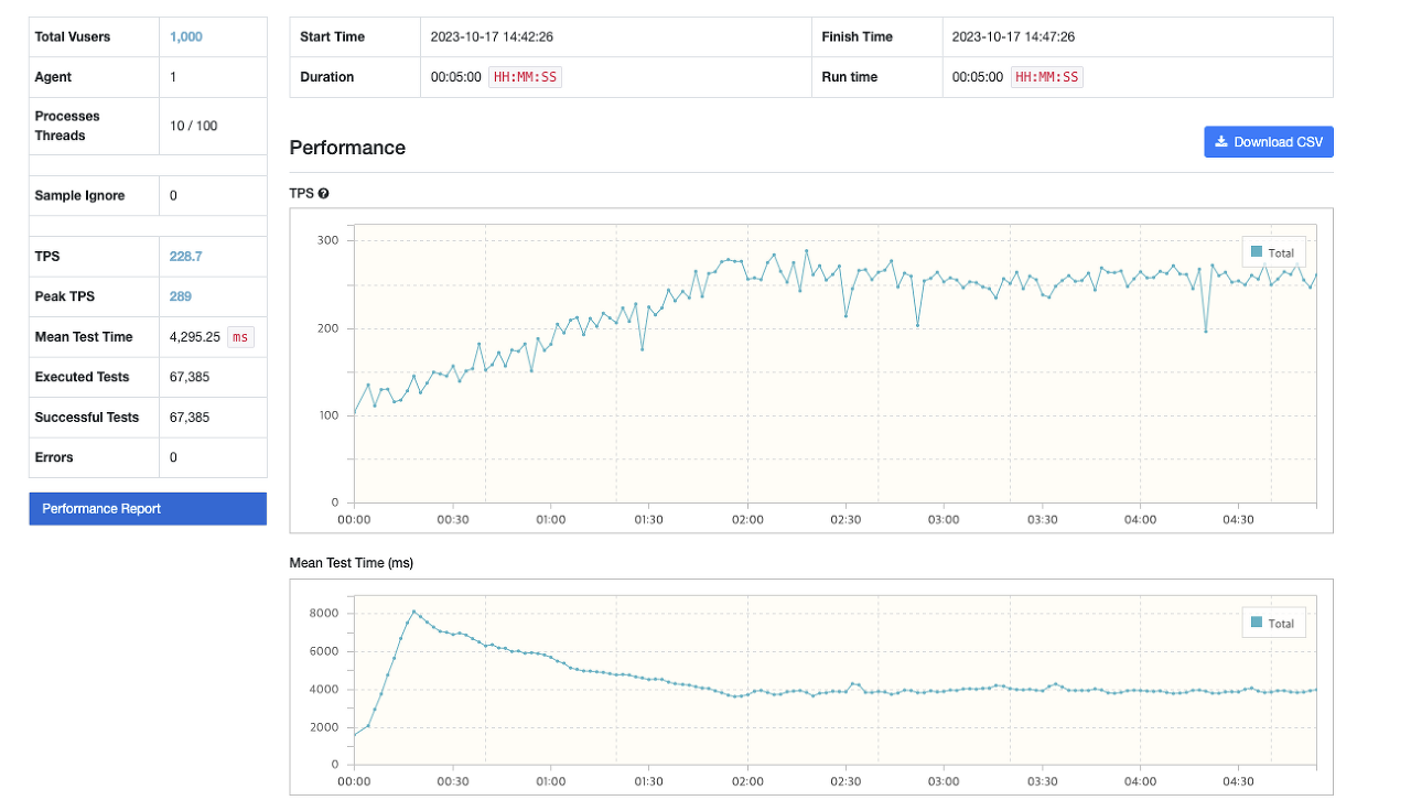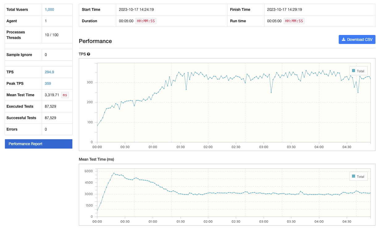 프로세스 10개에 쓰레드 각각 100개로, 총 1000개의 가상 Agent를 사용해 5분 동안 점진적으로 요청을 보냈고, interval은 1000ms로 설정했다.