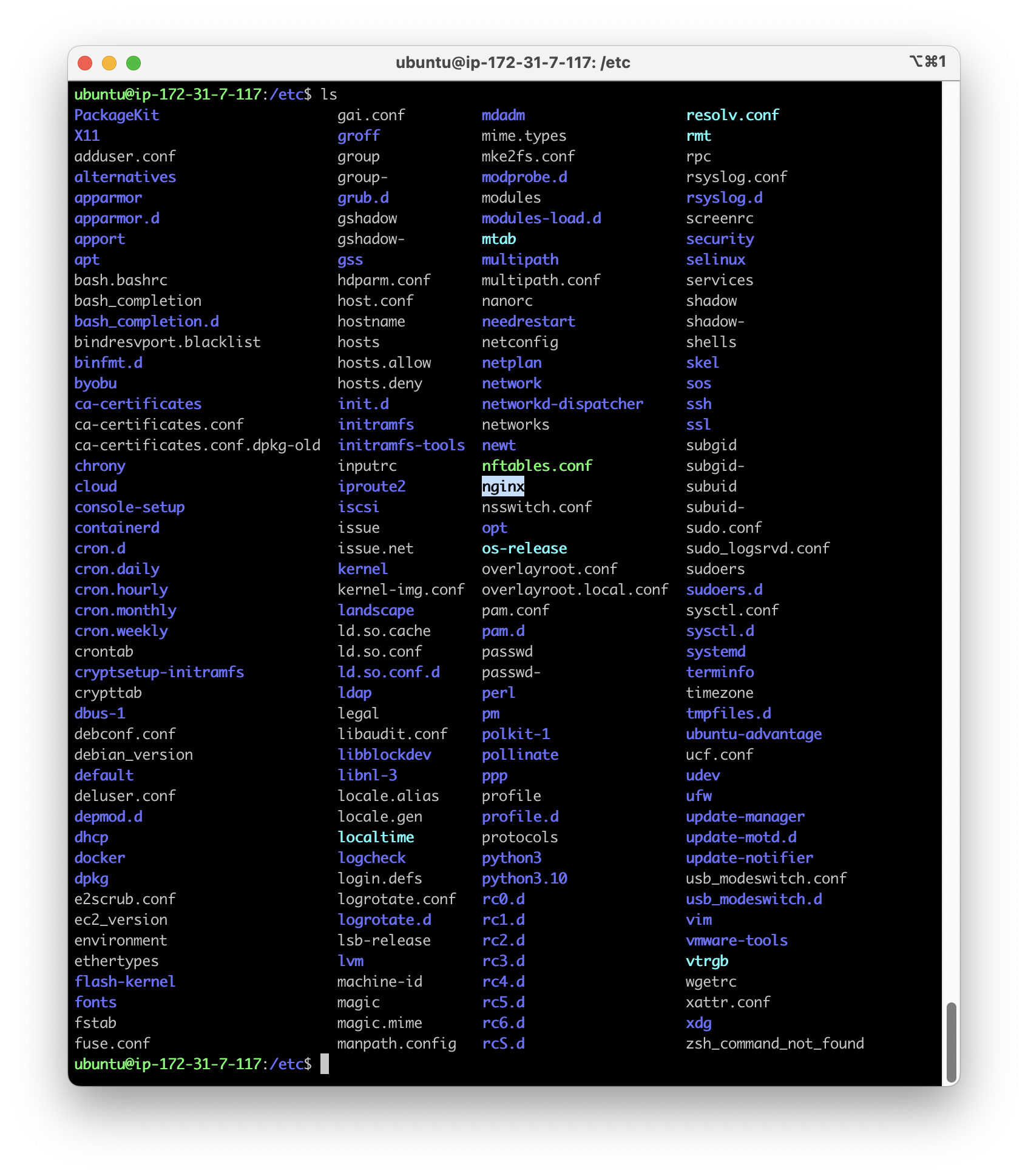 정상 설치되었다면, cd /etc 로 이동하면 거기서 nginx 디렉토리가 생긴 것을 확인할 수 있다.
