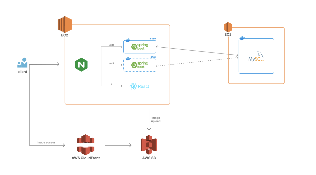 무중단 배포를 위해서, 서버를 2대 둘 수도 있겠지만, 우리 팀은 돈을 못 벌고 있기 때문에 아래와 같은 구조를 사용하기로 했다.