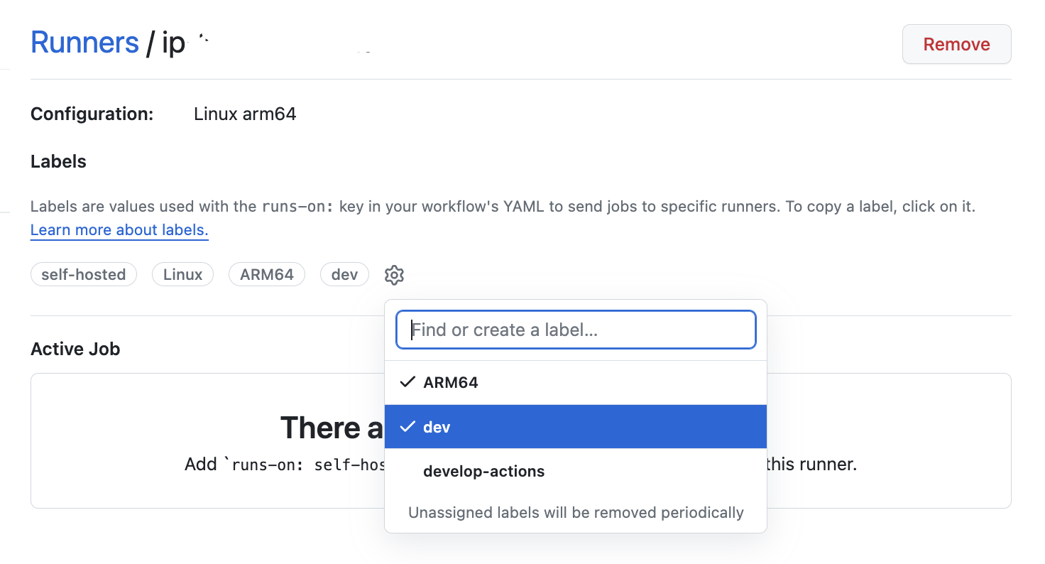 긍까 지금 러너에 저 라벨을 두 개를 붙여줘야 하는 거다. 전자는 기본으로 붙게 되니깐, dev만 새로 붙여주면 된다.