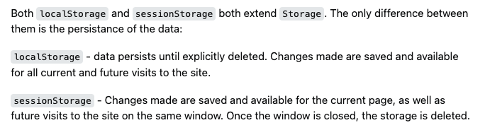 - 둘의 차이점은, 브라우저 창을 닫았을 때, 데이터가 보존되는가에 있음!