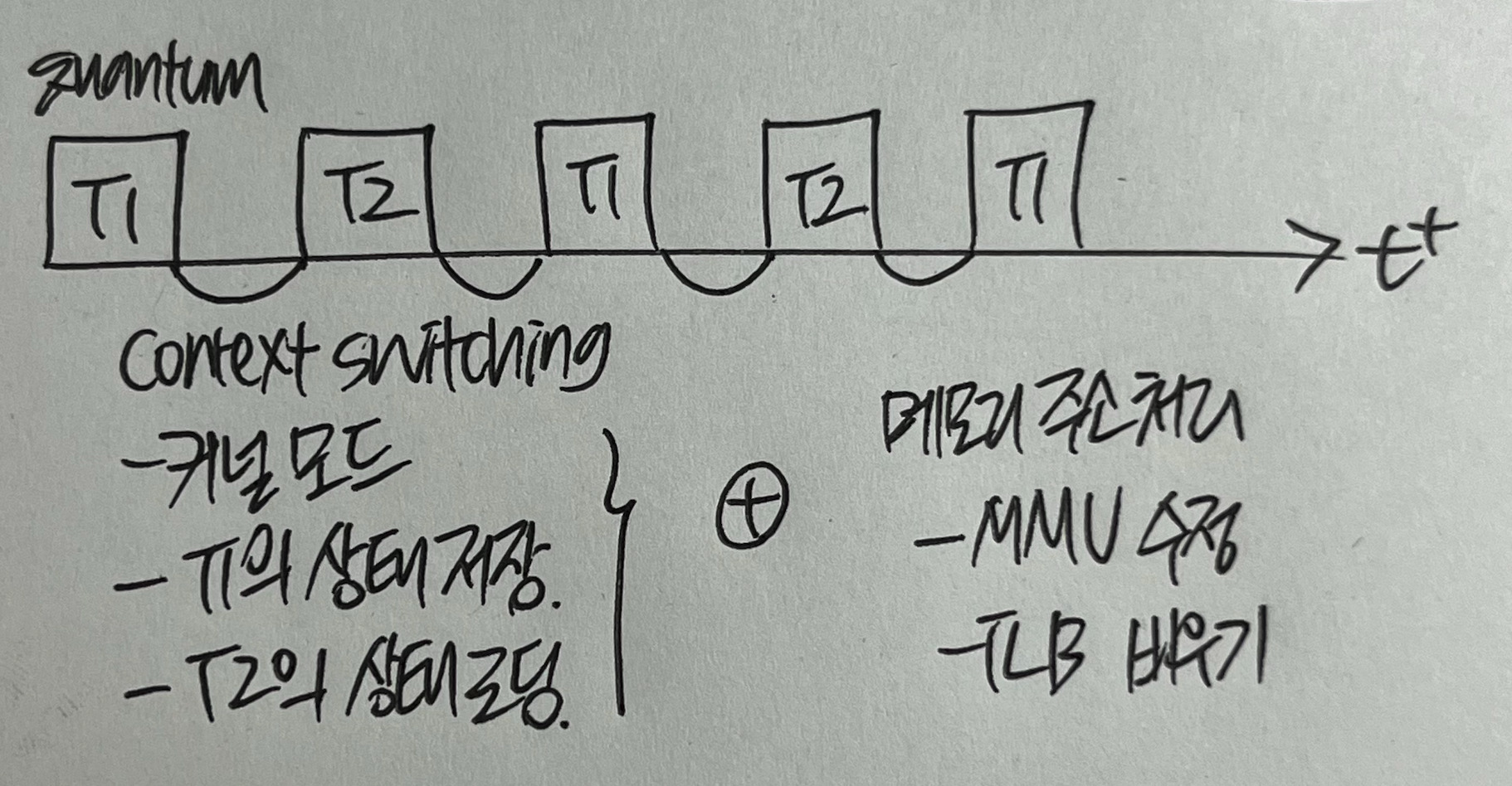Process Context Switching 과정 = 커널 모드 전환 + CPU register 상태 교체 + 가상 메모리 주소 처리(MMU 수정 + TLB 캐시 비우기)