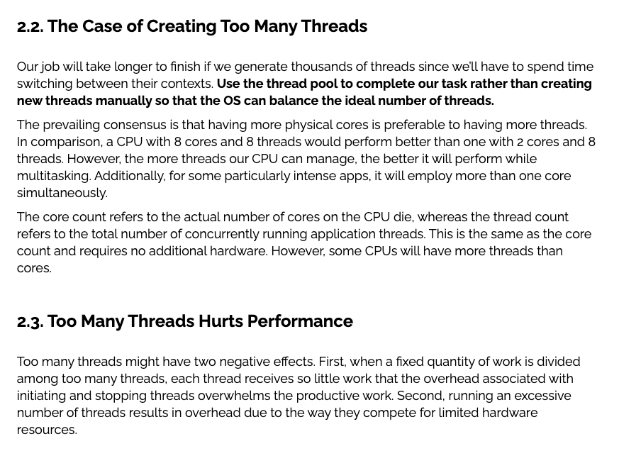 코어의 개수만큼, 아니면 코어 개수에서 크게 벗어나지 않는 선에서(1개로 제안함) 스레드 개수를 설정하는 것이 효율적이다.