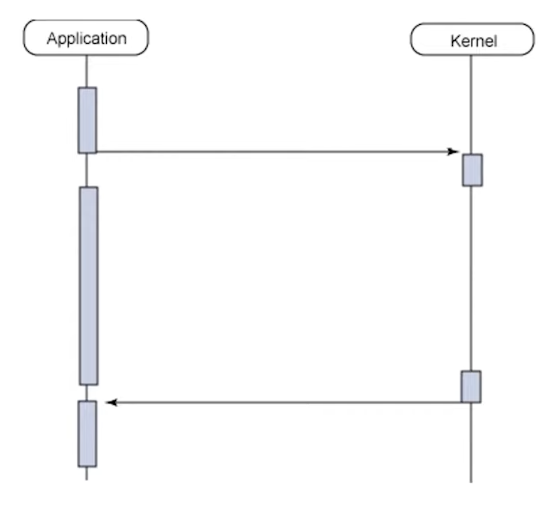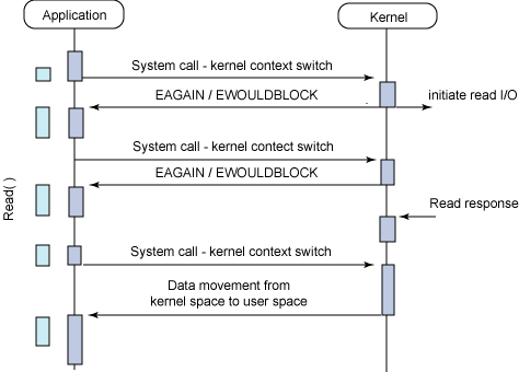 또 위 방법에서 보시면, 커널이 I/O 작업으로부터 Read response를 받는 시점과 애플리케이션이 data movement를 받는 시점 사이에 time gap이 있는 것을 확인할 수 있습니다. 이 time gap을 통해 해당 방식이 I/O의 지연을 유발한다는 것을 확인할 수 있습니다. ⇒ 비효율적입니다!