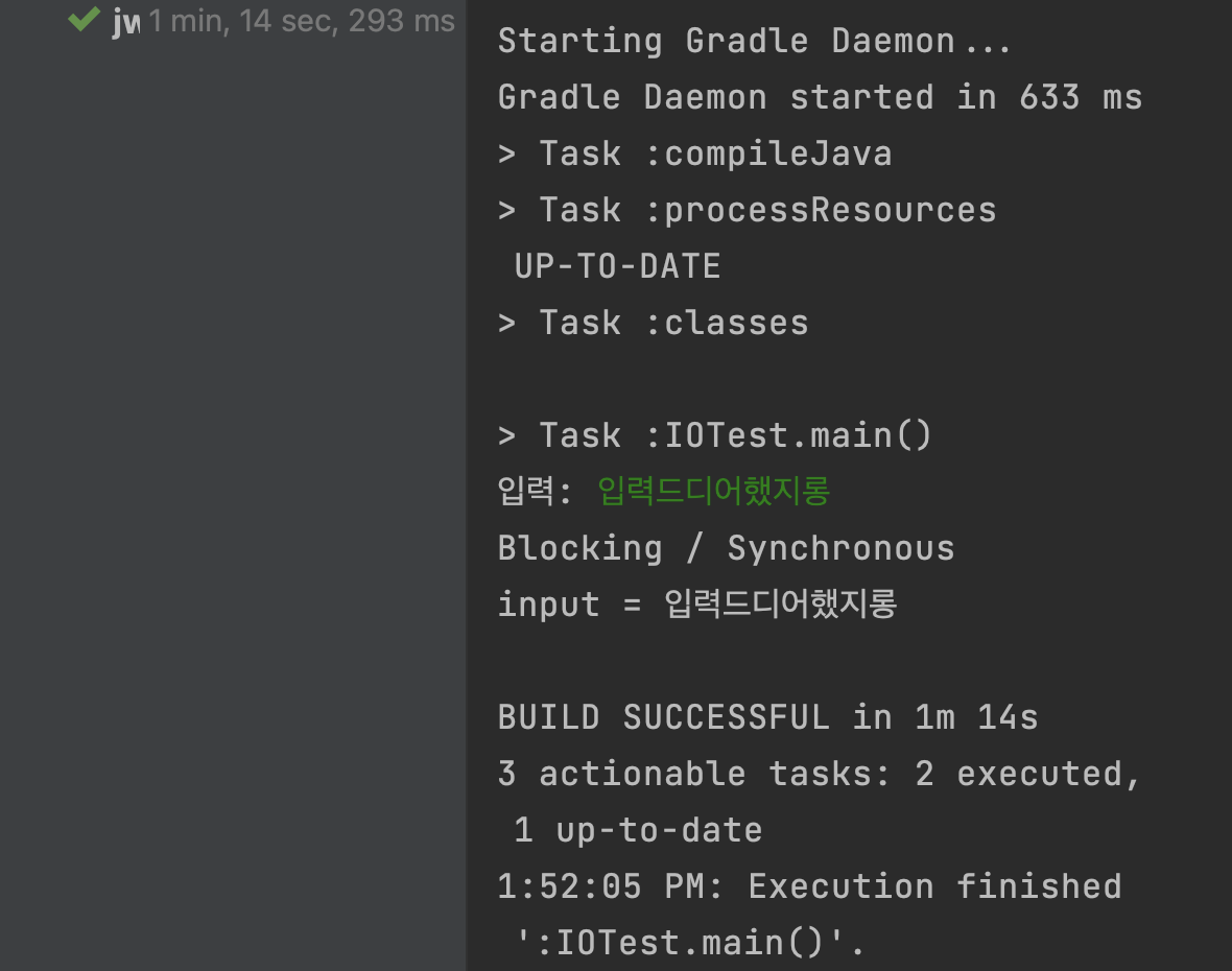 입력이 일어날 때까지 마냥 대기하는 것이 아니라, non-blocking 방식이기 때문에 이어서 다른 작업을 수행하고, synchronous하기 때문에 입력값이 돌아오면 곧바로 입력값에 대한 처리를 합니다.