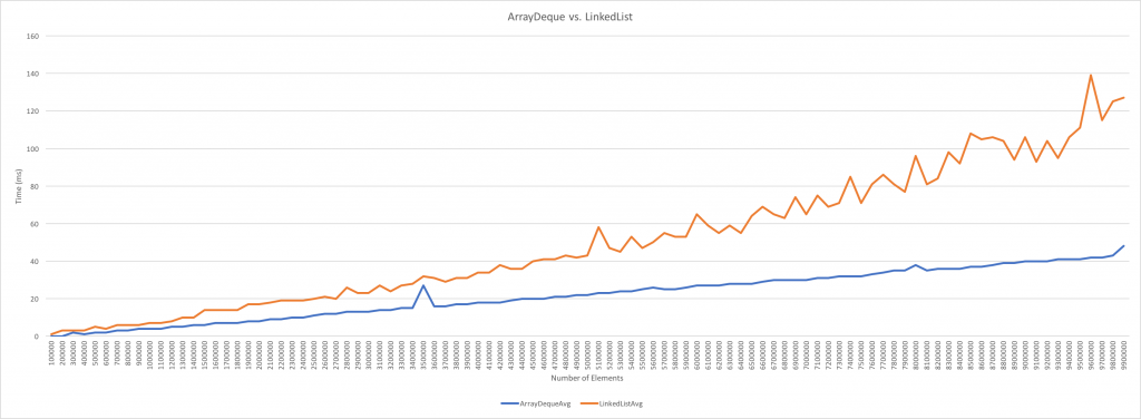 암튼 중요한건 데이터 크기에 따라서 LinkedList, ArrayDeque로 실습을 진행했는데, 다음과 같은 결과를 얻었다.