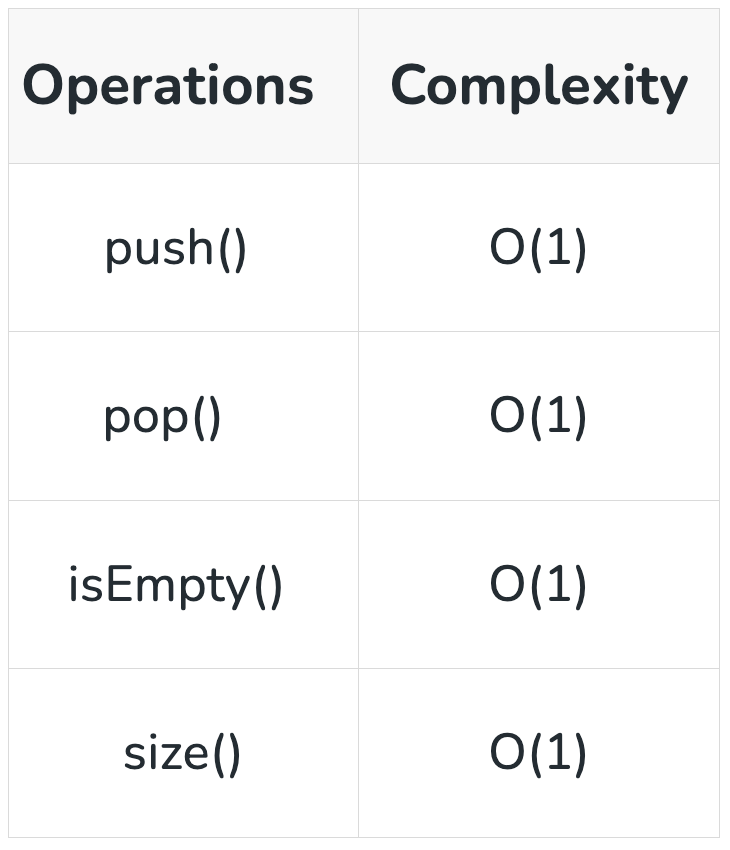 - 스택의 데이터 개수를 확인하는 연산입니다. push(추가) 및 pop(삭제) 연산 시에 스택 크기를 업데이트하면서 관리하다가, 단순히 해당 변수의 값을 반환하면 되기 때문에 상수 시간에 수행되므로 O(1)입니다.