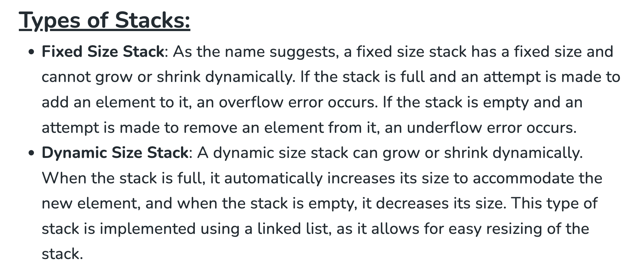 LinkedList를 사용한 스택에서는 맨 끝에 데이터를 직접 추가합니다. 이 작업은 상수 시간에 수행되므로O(1)입니다. - 배열 기반 스택에서 크기를 늘리는 연산이 발생할 때에는 해당 연산이