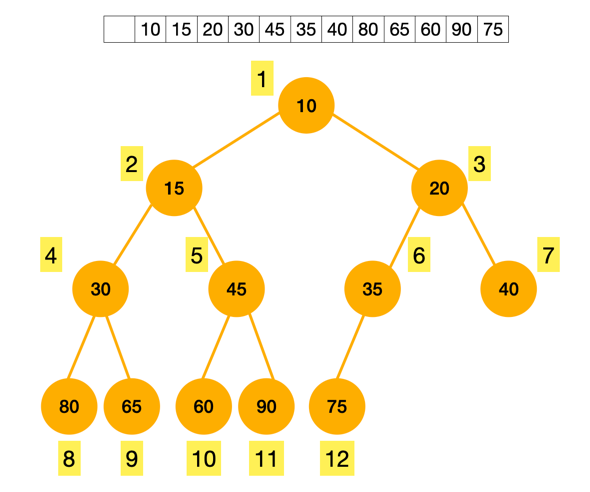 - 완전 이진 트리이기 때문에 (마지막 레벨을 제외하고는 빈틈이 없이 노드가 다 채워져 있음) 부모 노드의 인덱스를 i라고 했을 때, 자녀 노드의 인덱스를 알 수 있습니다. (노드 번호는 1부터 시작하는 인덱스 기준)