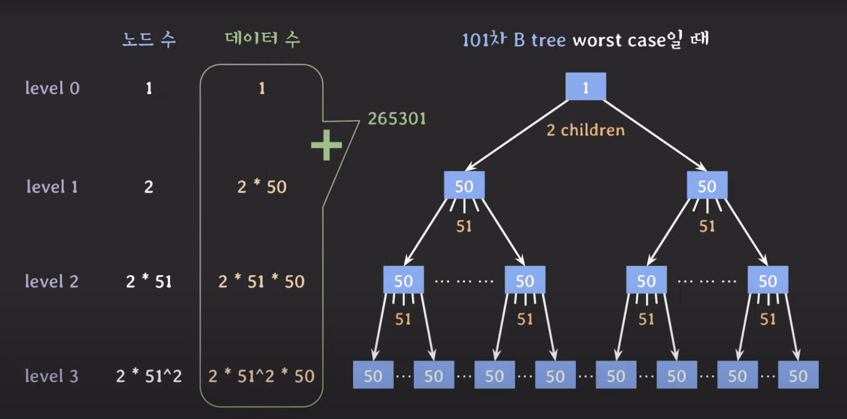 ⇒ worst case에서도 약 26만 개의 데이터에 3번의 secondary storage 접근으로 모든 데이터를 탐색할 수 있다. (이정도면 우수함!)