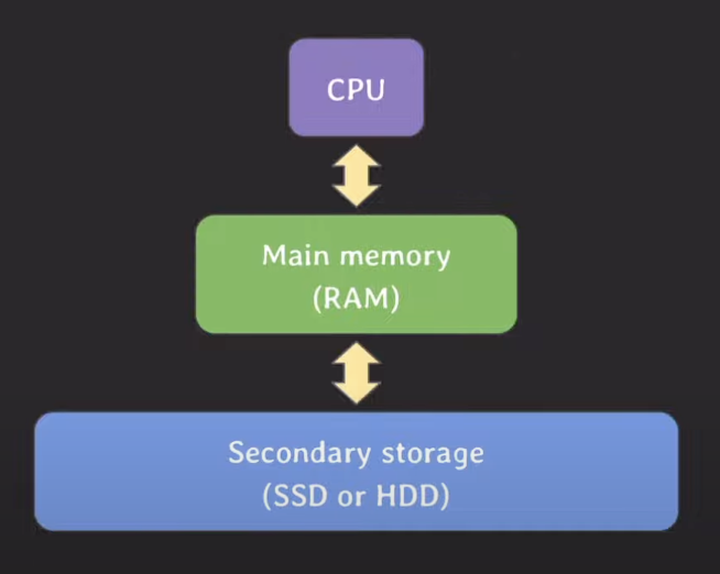 휘발성메모리로, 전원이 켜진 동안에만 데이터를 저장할 수 있다.- secondary memory보다 데이터 처리 속도가 빠르다(